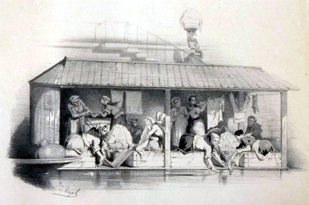 Inquiries into the reclaimed royal regalia lead to the syndicate committee member charged with storing them. The group finds Anne Bergue working on a floating washing house, one of many such remarkable waterborne establishments plying the waters of the Seine.